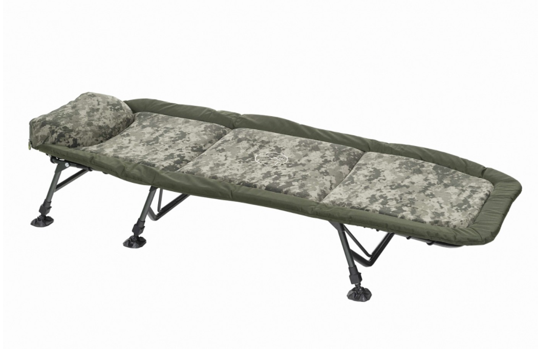 Extrémně lehké, velké a 100% ploché lehátko ve velice atraktivním designu s digitálním maskováním. Nadstandardně silná a velmi komfortní matrace s fleecovou vrchní vrstvou nabízí nejúčinnější systém regulace tuhosti pomocí elastického šněrování na spodní straně. Další výhodou jsou nohy s rozměrnými výkyvnými patkami a možností velkého vysunutí. Lehátko je dostupné ve variantě s osmi nebo se šesti nohami.