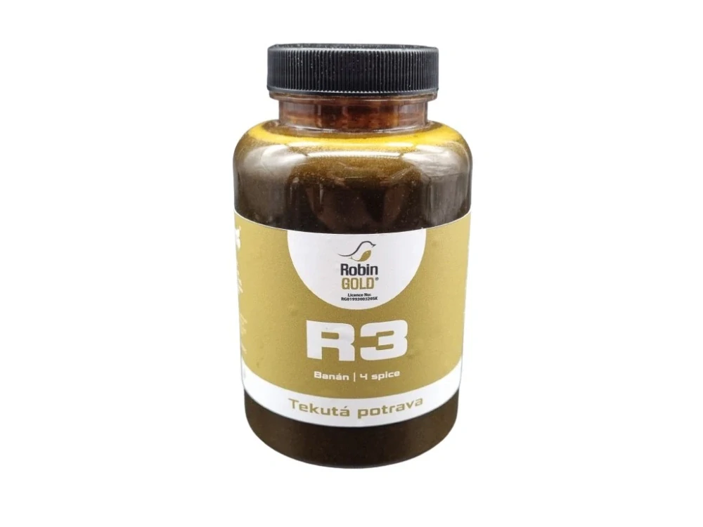 Tekutá potrava je vyráběna ze složek receptu R3. To znamená, že obsahuje všechny atraktanty, koření, které jsou použity v boilies. Je velmi nutričně, pachově atraktivní. Zanechává výraznou pachovou stopu, drží se bodově v místě krmení a nerozplývá se do velké dálky. Je vhodná pro bodové krmení. R3 je boilie který obsahuje čistých 20% originál Robin goldu, jeho barevnost je tak přirozená. Byl vyvážen rybími moučkami, jemným ptačím zobem Birdfood s anýzem a vyváženým poměrem 4 kořene v kombinaci s tygřím ořechem a banánu pro dosažení rychlých záběrů.