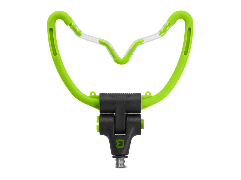 Držák na feeder tvaru V je univerzální, spolehlivý a bezpečný držák prutu. Tvar V zajišťuje plynulý chod vlasce během záběru. Díky důmyslnému systému tlačítka ve spodní části, lze tento držák polohovat a následně polohu zajistit. Šířka ramen je 14,5cm. Užitečným doplňkem držáku jsou očka pro uchycení háčku, do kterých můžete zachytit háček například při plnění feederového košíku. Držák má na těle umístěny 4 otvory pro chemické světlo, což oceníte zejména při nočním rybolovu. Držák je osazen univerzálním závitem a je kompatibilní s většinou vidliček a stojanů dostupných na trhu. Barevná zeleno-černá kombinace dokonale doplňuje feederovou řadu REAXE.