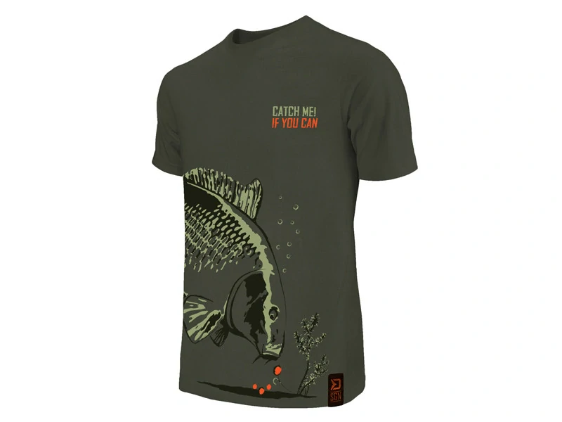 Série CATCH ME IF YOU CAN (chyť mě pokud to dokážeš) s vyobrazením kapra je nevšední kousek do vašeho, nejen kaprařského šatníku. Malba kapra přechází kolem dokola celého trupu v jeho spodní části. Kapr je zobrazen jako skica, či malba při zachování všech důležitých detailů. Ryba je zachycena v situaci, kdy se blíží k hrsti boilies, což je právě ten moment, na který všichni na břehu čekáme. Tričko je designováno do tmavě zelené barvy s efektní oranžovou a světle zelenou grafikou.