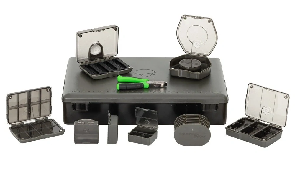 Trvalé stěny v boxu na náčiní jsou rozmístěny tak perfektně, aby se do nich vešly naše návazcové šňůrky, Sady krabiček, Bait Floss, Leadcore, Arma Kord, Leader Safe pouzdro a krabičky Kamakura háčků spolu s dalšími předměty, jako jsou nůžky a jehly.