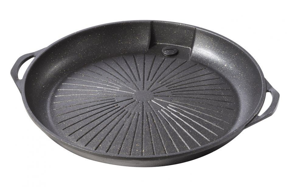 Hliníková grilovací deska s nepřilnavým povrchem, otvor pro odtok tuku.